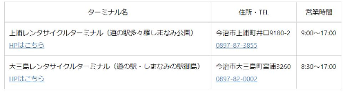 上浦レンタサイクルターミナル(道の駅・多々羅しまなみ公園)と大三島レンタサイクルターミナル(道の駅・しまなみの駅御島)です。