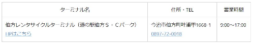 伯方島のレンタサイクルターミナルは、伯方レンタサイクルターミナル(道の駅・伯方S・Cパーク)です。