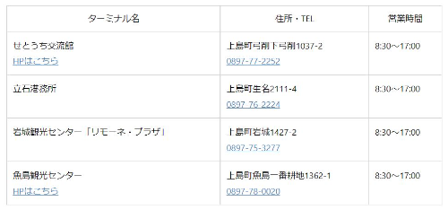 越智郡上島町にあるレンタサイクルターミナルは、せとうち交流館、立石港務所、岩城観光センター「リモーネ・プラザ」、魚島観光センターの4ヶ所です。