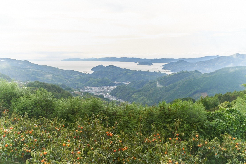 八幡浜市国木地区へ到着しました! なんて素晴らしい景色! 海越しに佐田岬半島が見えます。そして、手前には橙色の大きな実がたくさん!!