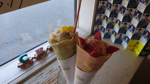 西条に住む若者なら学校帰りに一度は寄り道した青春の味ラブクレープ。すべて注文を受けてから作るので、外は「パリッ」、中は「しっとり」した、できたてのクレープです。メニューの種類も豊富で、イートインスペースもあります。もちろんテイクアウトも。