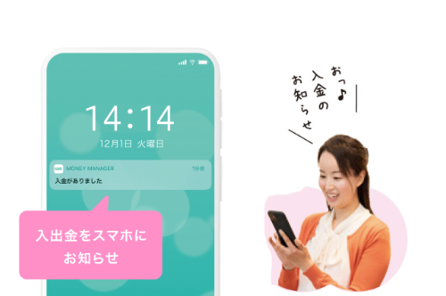 振り込みや引き落としなど、入出金があるとスマホに知らせてくれるプッシュ通知機能が付いています。身に覚えのない入金や出金にすぐ気づくことができるので、悪用対策につながります。子どもや高齢者など、家族の口座も守れます。