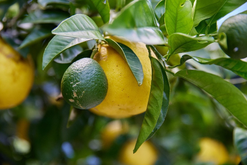 これです! 実ったばかりの青い実と、丸々とした黄色い実が同じ木に!