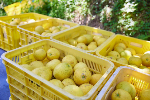 河内晩柑がゴロゴロ入ったキャリー箱が並ぶ姿は圧巻!収穫を待ちながら雨風に耐えた果実の外皮からは何とも言い難い風格が感じられます。