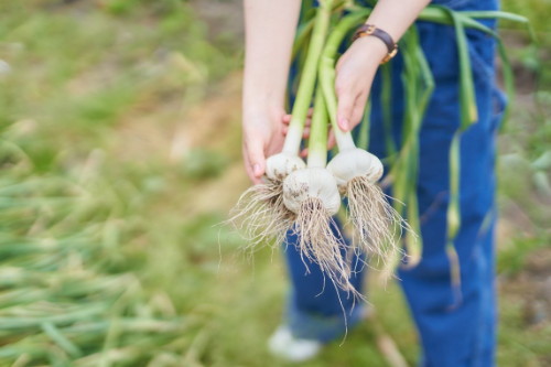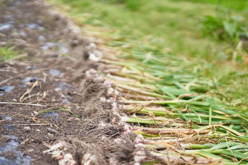 私も収穫に参加! 根元部分に鼻を近づけると爽やかなガーリックの香りがします。