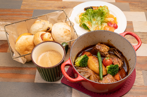 パンの販売だけではなく、奥のカフェスペースではココット料理と焼きたてのパン、ドリンクなどのカフェメニューを味わうこともできます!