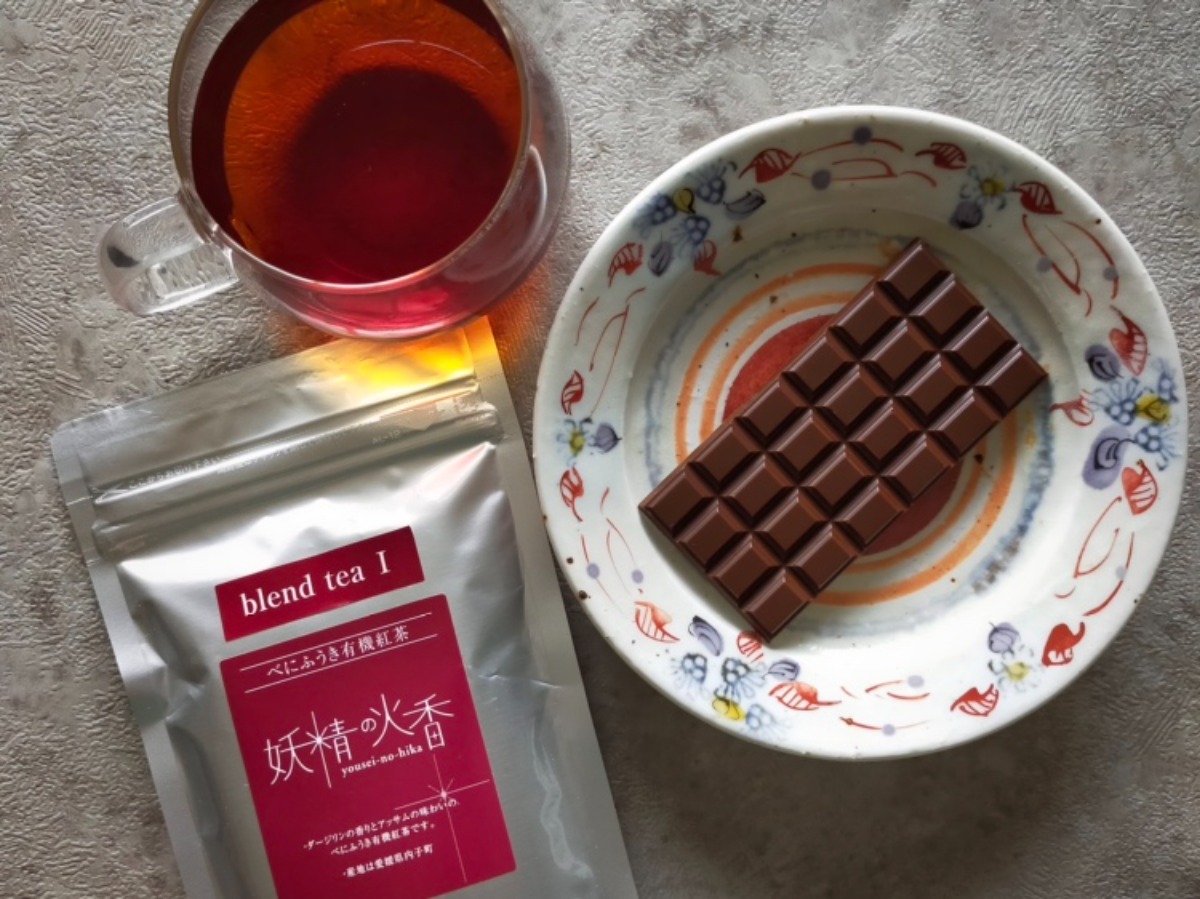 内子町「にのらく茶園」の「有機栽培べにふうき紅茶」を使用。じんわり広がる紅茶の風味とカカオのコクが深い味わいを醸し出す。