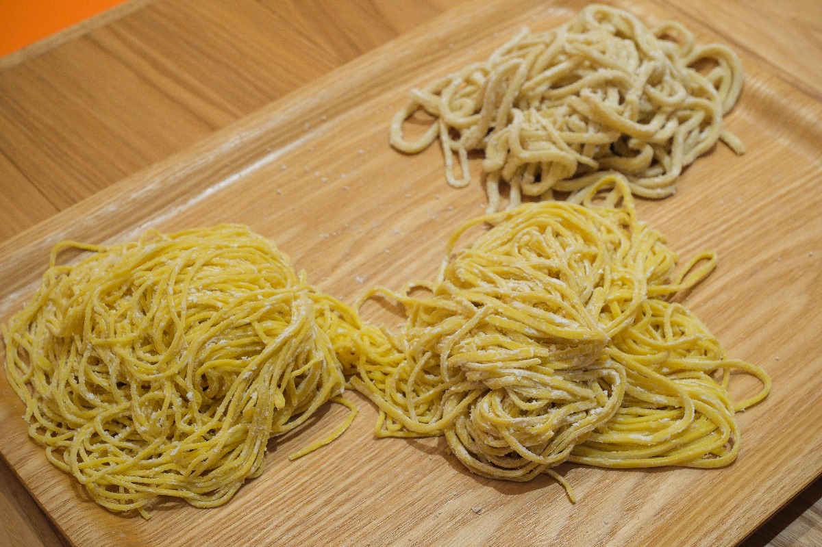 麺はすべて自社製で、試作を重ね、太さや薄さを調整することで理想の透明感やもちもち感を実現。「鶏ガララーメン」「煮干しラーメン」は細麺、「家系ラーメン」は平麺、「二郎系ラーメン」は太麺と、ラーメンによって使い分けているのが特徴。