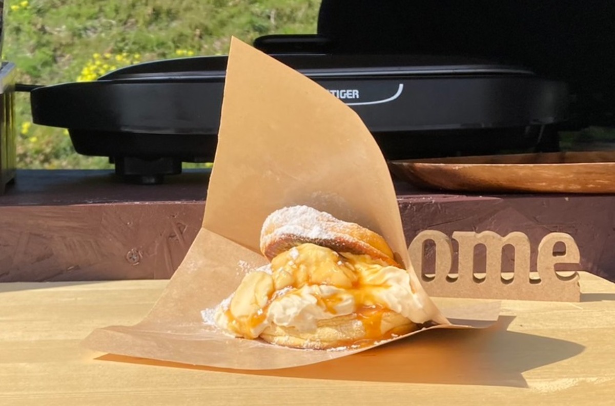 手軽に食べられる「パンケーキサンド」のキッチンカーが登場。人気は、外はふんわり、中はパリッとした「いちごミルフィーユ」。追加でイチゴのトッピングも可能でクリームとの相性抜群! どの種類もクリームとソースが増量可能。