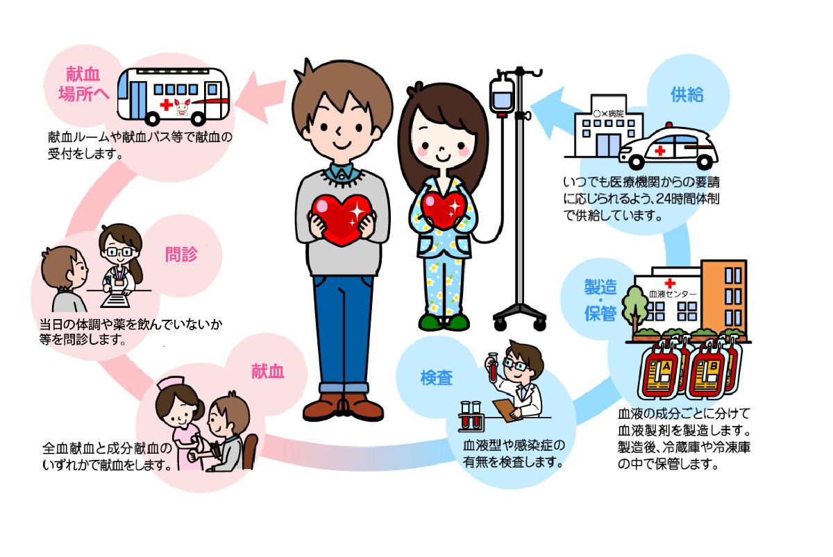 献血とは、病気の治療や手術などで輸血や血漿分画製剤を必要としている患者さんのために、健康な人が自らの血液を無償で提供するボランティアです。