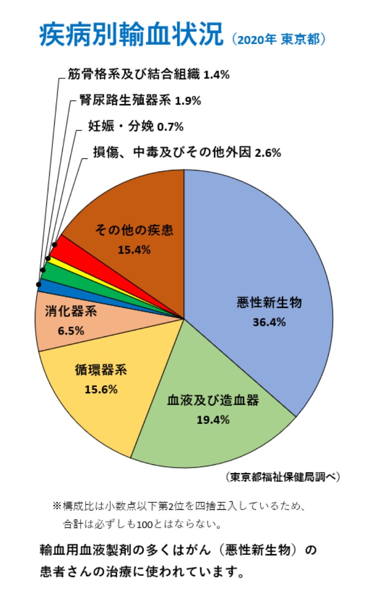 献血を必要とされている人の多くは、不慮の事故等に伴うものではなく、がん(悪性新生物)の患者さんの治療に使用されています。