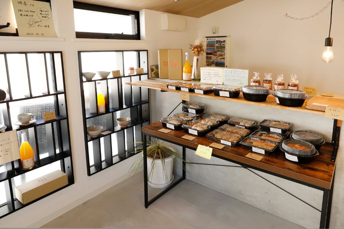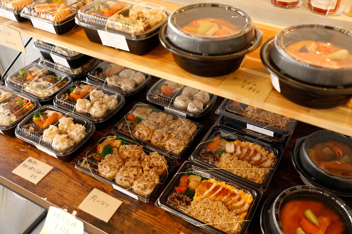 器やジャムなどが綺麗にディスプレイ。仕出しや弁当の取り置き、配達なども受け付けています。