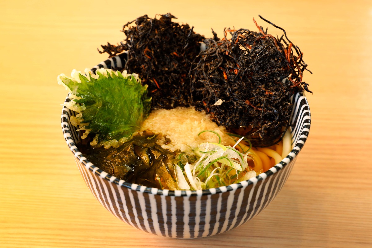 島で採れたひじきの天ぷらや生わかめ、大葉をのせた「しまうどん」。パリパリ食感のひじきの天ぷらは、そのままでも、優しい味わいのダシに浸して食べても美味しいです!