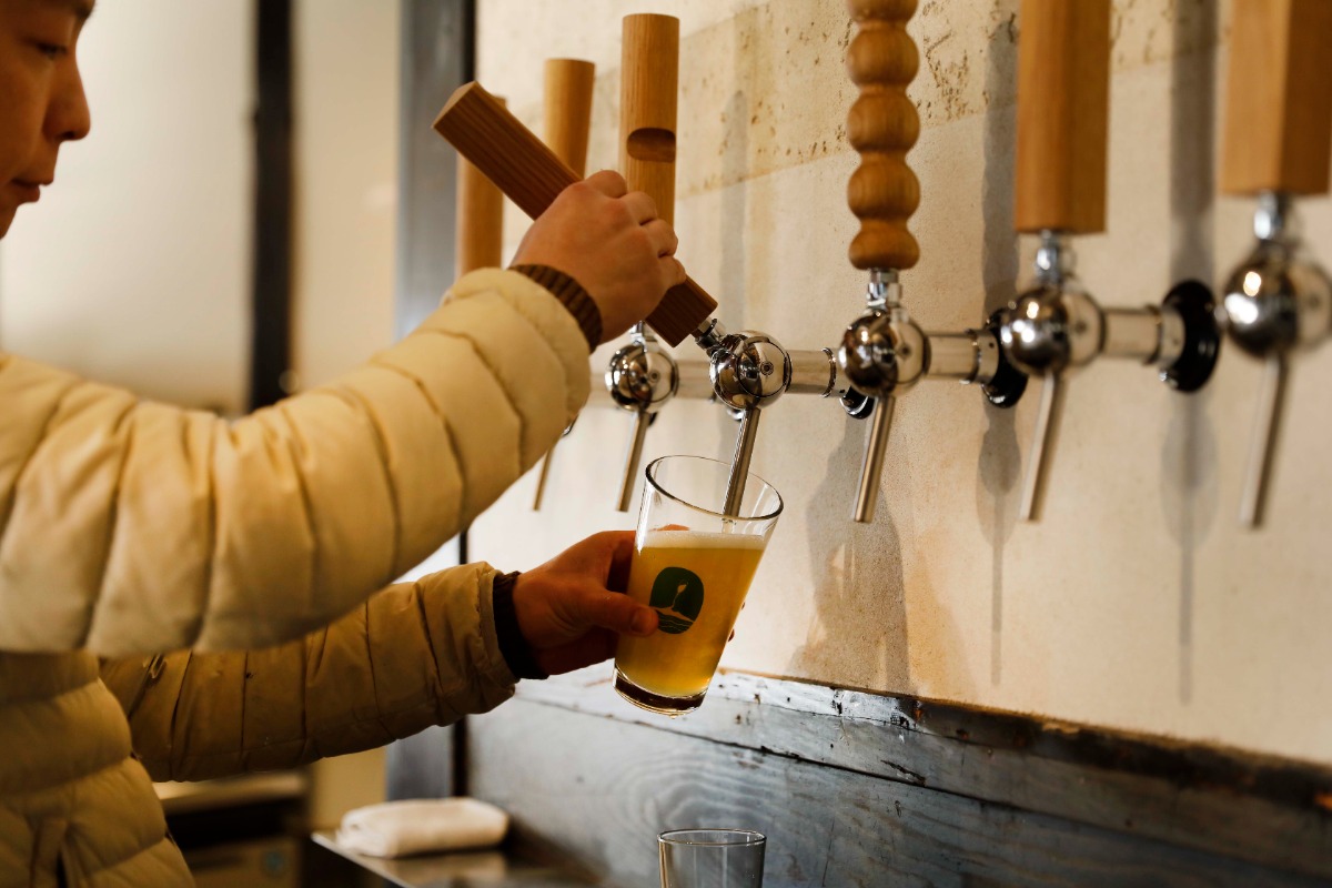 醸造所から直接つながるサーバーのタップは、木工作家が手掛けたもので一つひとつ形が異なります。