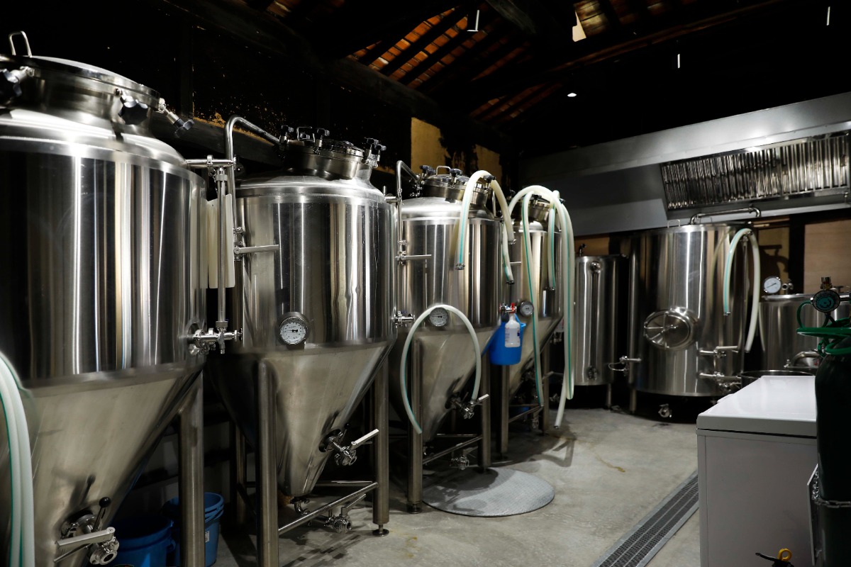 元々炊事場だった場所をガラス張りの醸造所に。大きな4つのタンクが目を引きます。