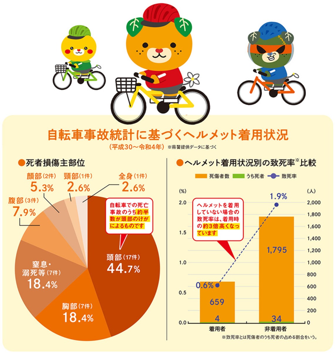 自転車での死亡事故のうち、約半数は頭部損傷によるもの。実際にヘルメットをかぶっていたことで、命が助かった人もいます。平成30年~令和4年県内事故統計より算出したところ、交通事故発生時、ヘルメット非着用者の致死率は着用者の約3倍も高く、ヘルメットは自分の命を守るために必要不可欠と言えるでしょう。
