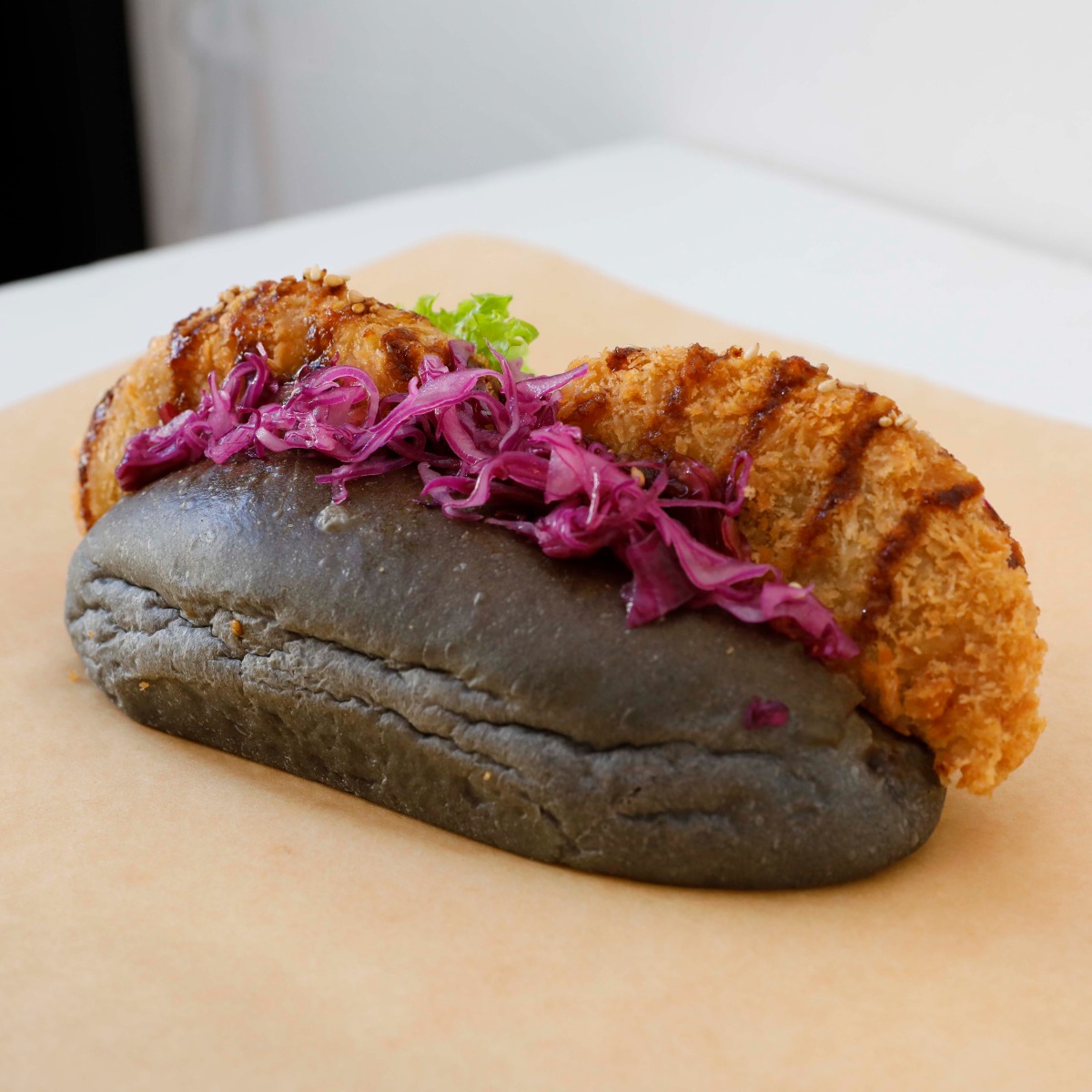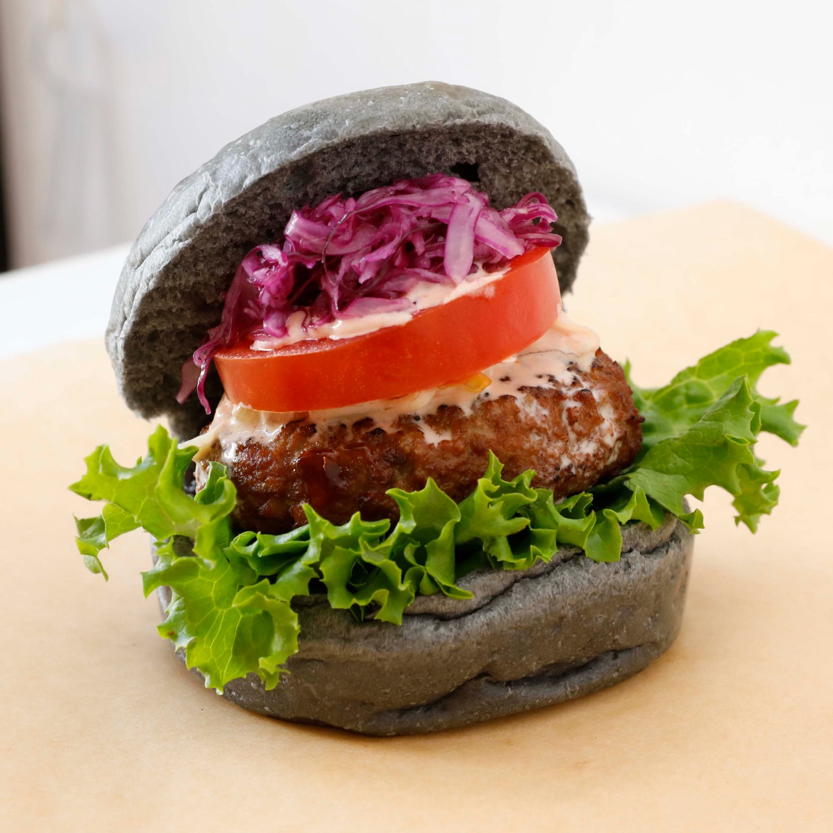 ミネラル豊富な竹炭バンズに、ハンバーグと野菜、紫キャベツラぺをサンド。さっぱりとして栄養満点です!
