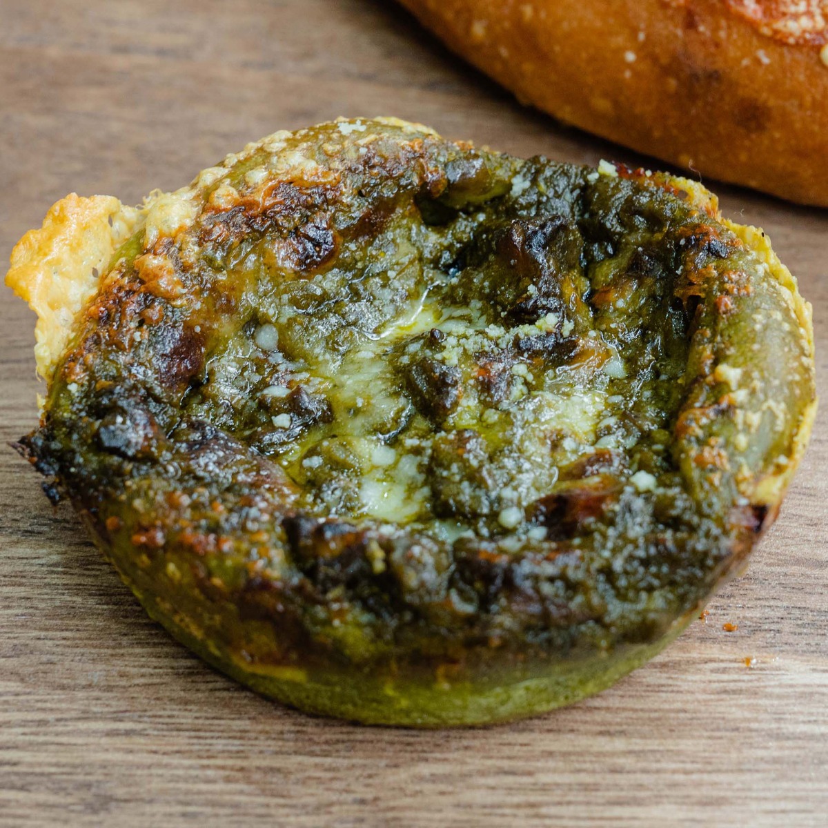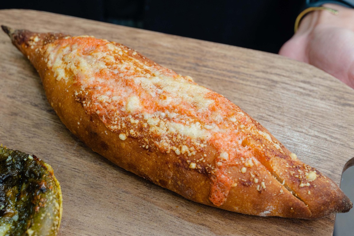 高加水で焼き上げた歯切れの良いフランスパンに、たっぷりの明太子バターを塗った自慢の逸品です。
