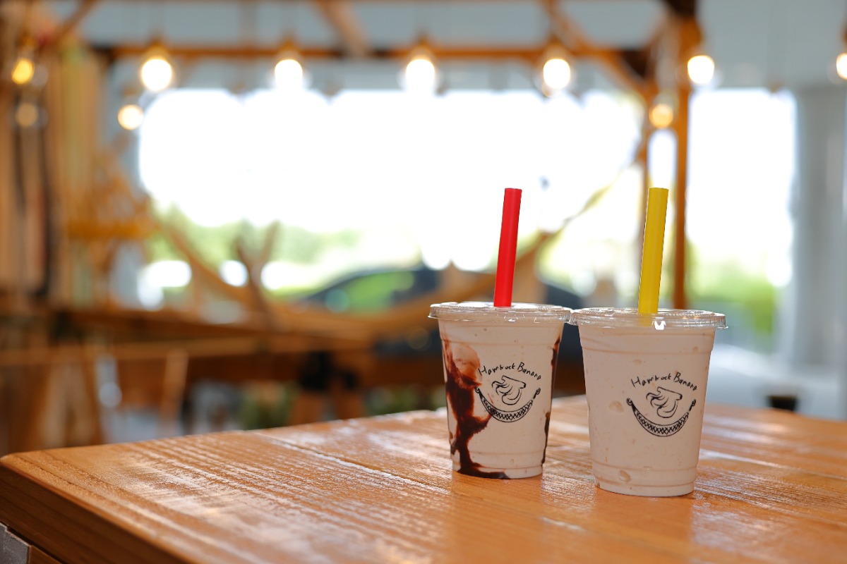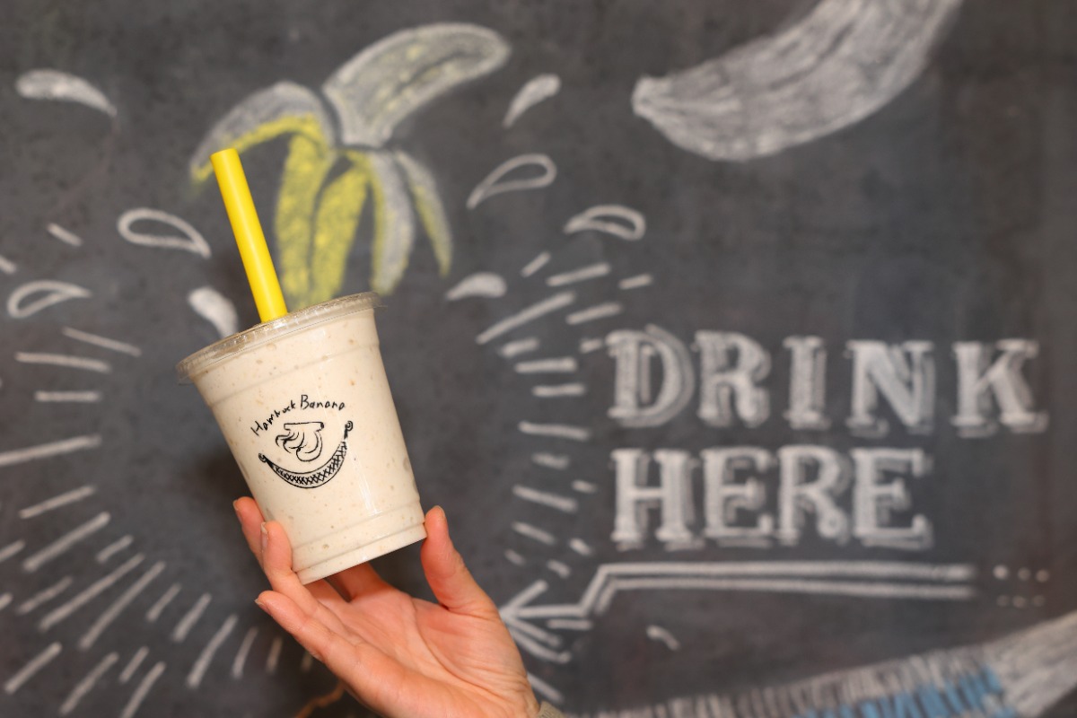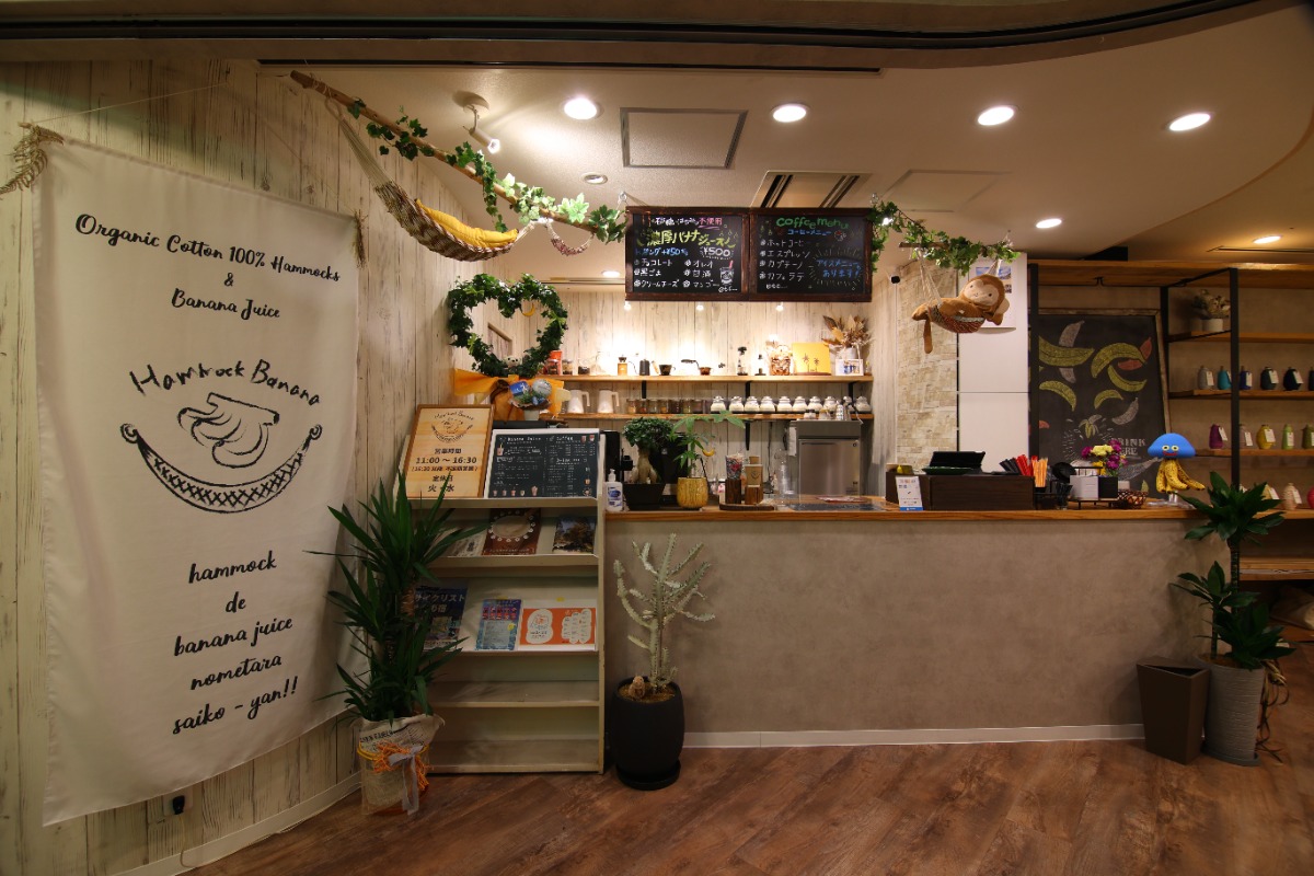 ハンモック職人が「濃厚バナナジュース」を販売。砂糖やハチミツ不使用で、熟成させたバナナ本来の味を楽しめ、中でも最初の15分が最上級の味わい。組み合わせ自由なトッピングは10種類以上あり、チョコやオレオが特に人気。他にも、コーヒーやリンゴジュース、スムージーなどバラエティ豊富な品揃え。店内の個性あふれるハンモックにも注目!