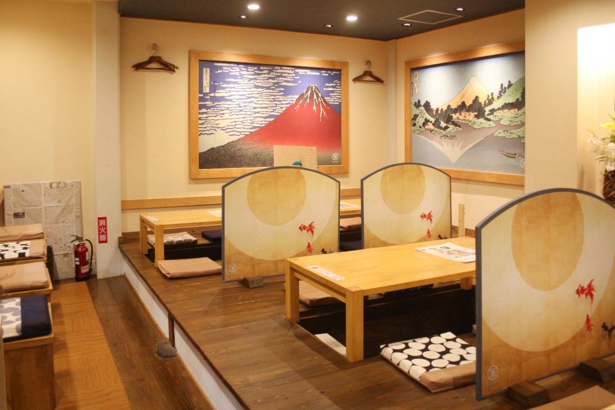 中に入ると、壁面には葛飾北斎の絵が壁一面に飾られ、日本文化をイメージした店内。カウンターや掘りごたつがあって、いろいろなシーンで利用できる。