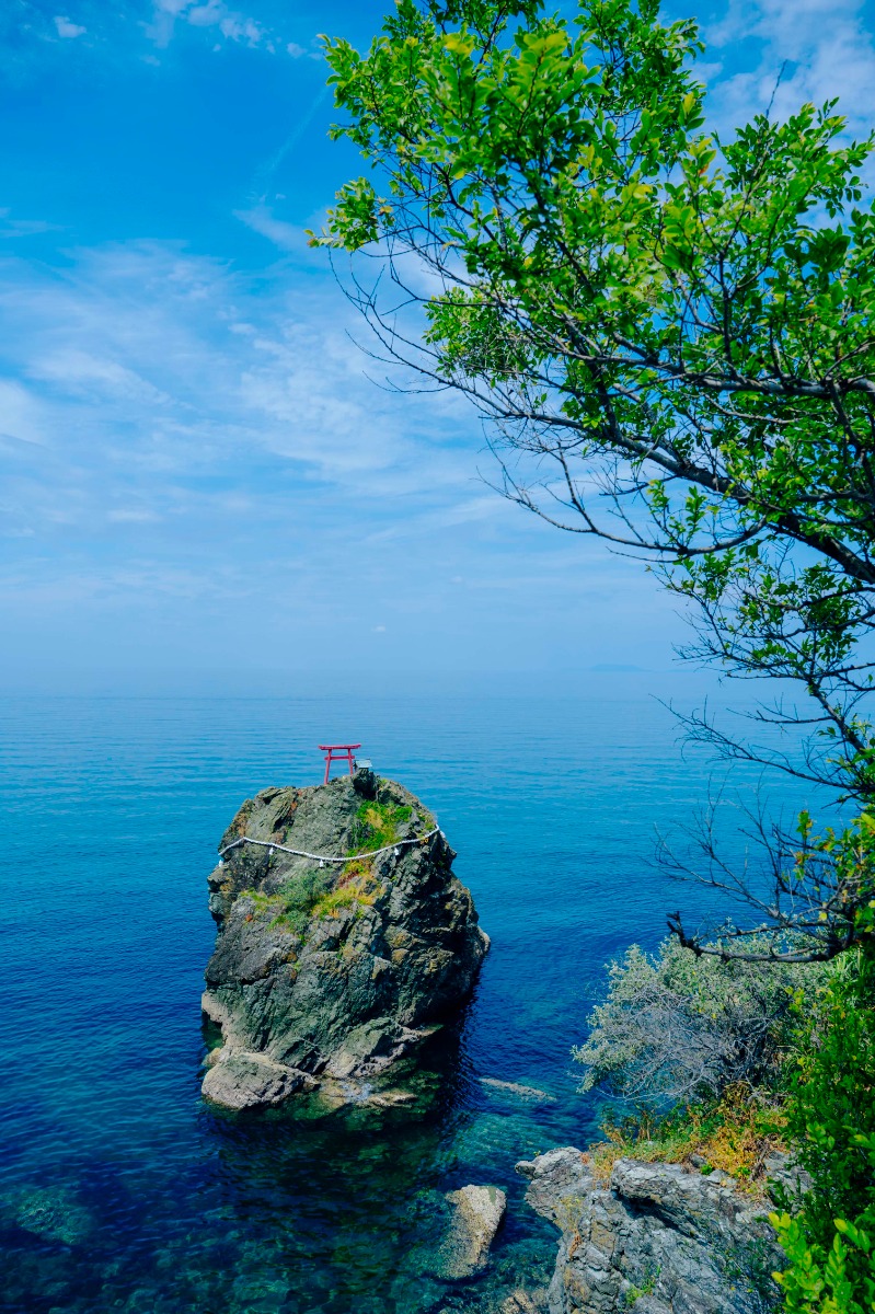 伊予市から大洲市長浜に向かう途中に見えてくるこちらの岩。海にポツンと浮かぶその姿は、まさに神秘的。天気の良い日には、透き通った海と青い空がまるで繋がっているかのように見えます。