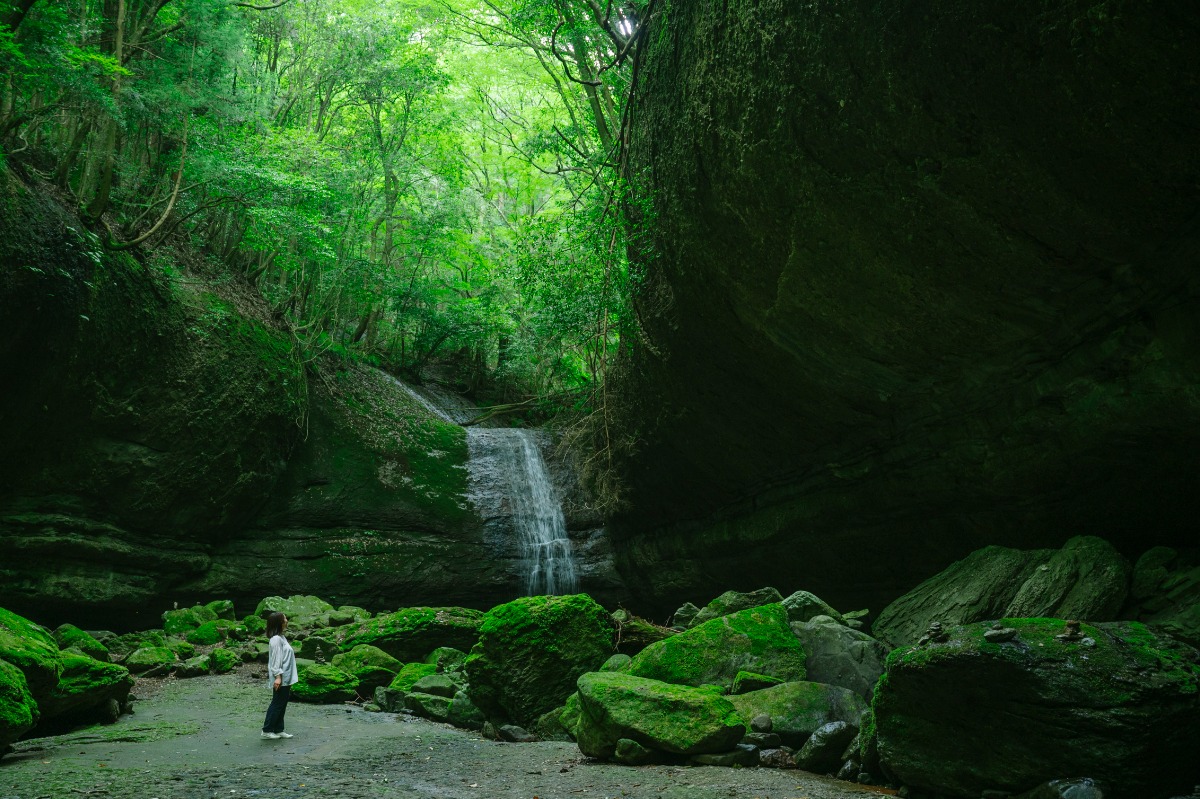 ついに、目的地「龍の腹」の最深部にある「奥の滝」に到着しました!小さな滝ですが、すぐそばまで近づくことができるので迫力満点です。ぜひみなさんもこの景色を実際に見てみてくださいね。