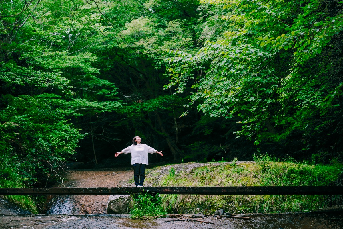 少し進むと、青々とした木々と足元には川が流れていています。反対岸に渡れるように橋がかかっているので、そこを渡ります。足元が滑るので注意してください。