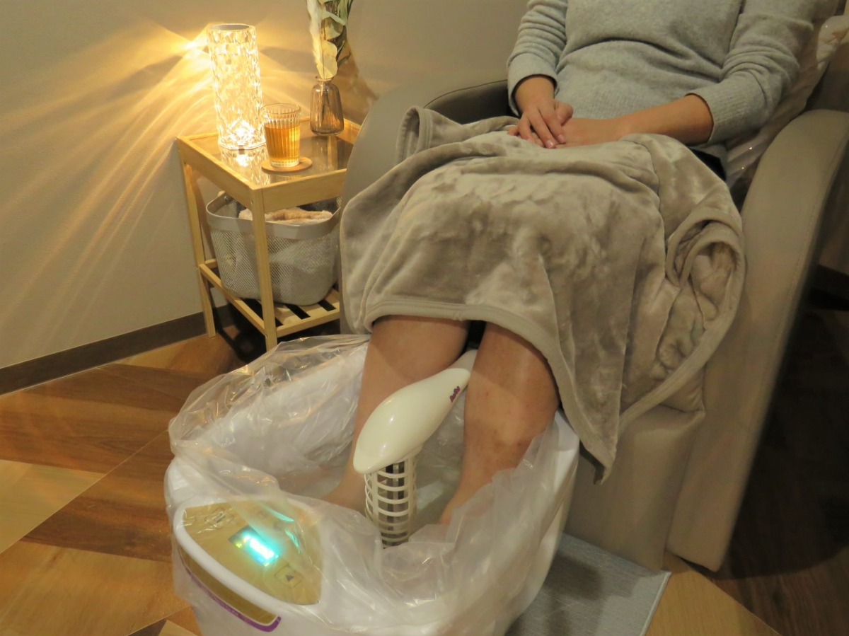 足湯のように足を浸けているだけで、高濃度水素水が発生。体内に取り込まれている有害貴金属・化学物質が排出され、水の色が変色していく。微弱電流が流れていることによって電気分解が起こり、化学反応により色の変化が起こる仕組みになっている。血液循環や代謝能力の改善、ホルモンバランスの回復を目指していく。