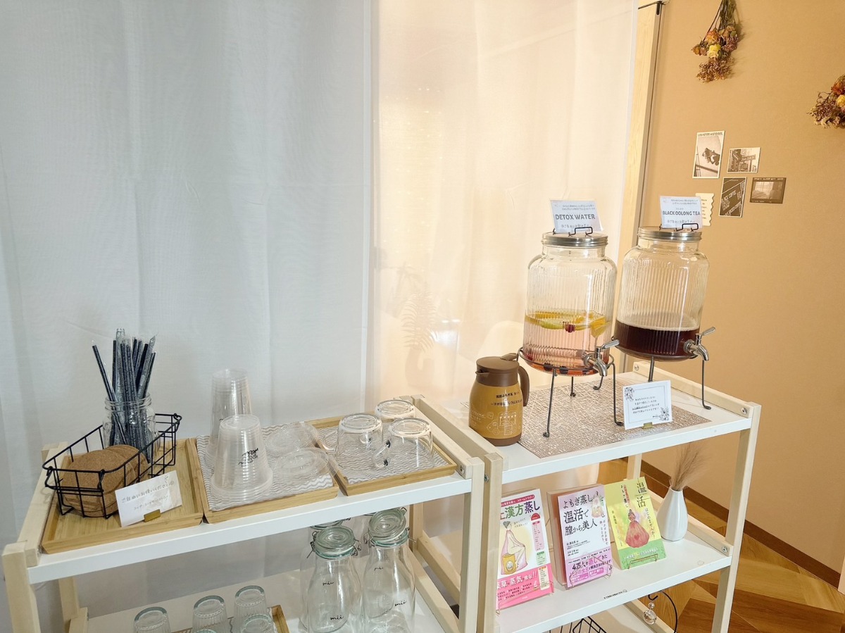店内に設置されているドリンクは飲み放題。健康に良い、黒ウーロン茶・デトックスウォーター・国産よもぎのお茶などがある。