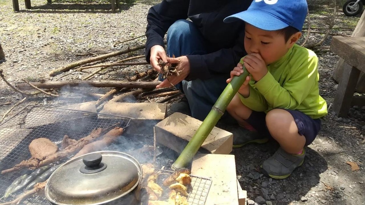 外で作る昼ごはんも楽しいひととき。焚火で味噌汁を作ったり、羽釜でご飯を炊くなど、自然を思いっきり味わえる内容になっている。