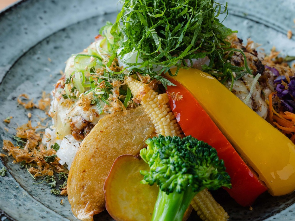 お店で人気の「ひよこ豆のカレー」と「ROY’Sオムライス」を掛け合わせたオムカレーに、大洲産野菜と魚介を彩りよくトッピング!。コク深い濃厚なルウと舌触りのいい卵が絡む具だくさんの限定カレーです。