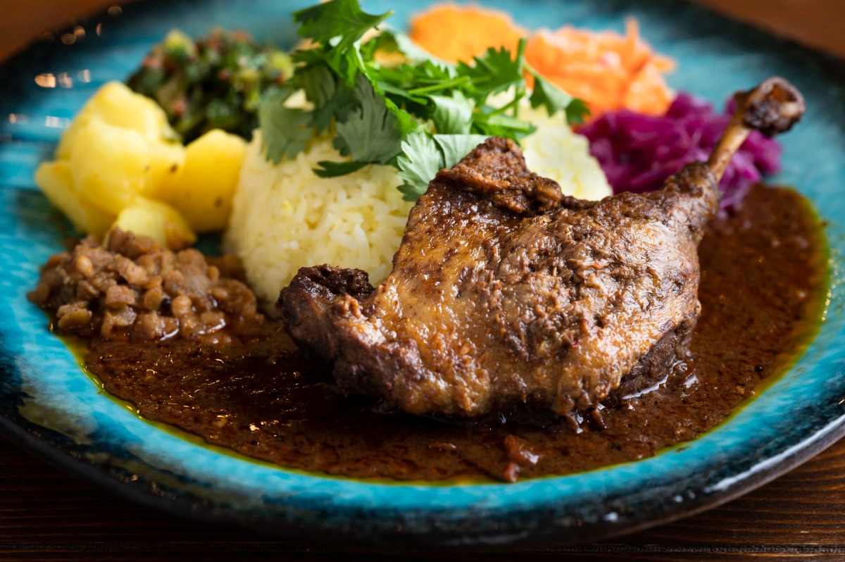 「普段より特別で贅沢なカレーを」という想いが形になった、鴨足をドーン! とのせたインパクト抜群のカレー。辛みのあるルウや種類豊富な副菜、鴨肉…。各々の味の違いを感じても、混ぜて食べても美味しい!