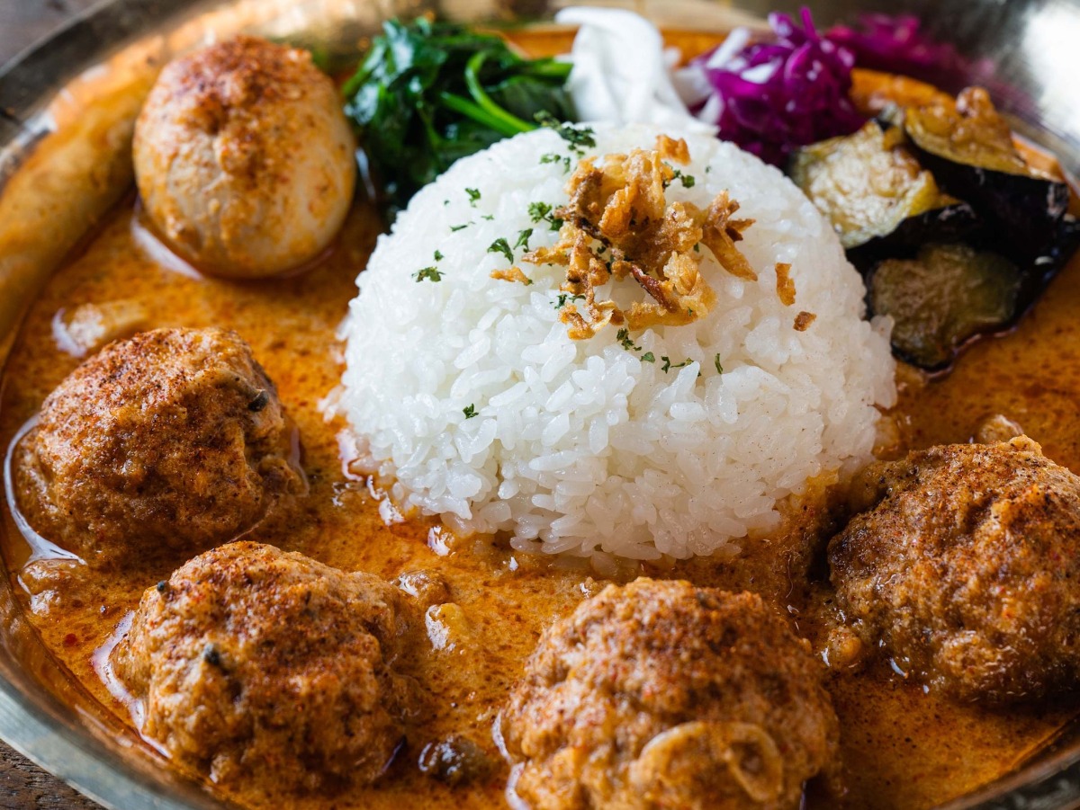 レモングラス・クミン・コリアンダーなどのスパイスに、ニンニクを加え、キノコと一緒に煮込んだマッサマンカレー。和牛の旨みたっぷりのミートボール(なんと4個入り)を崩して食べ進めてみて!