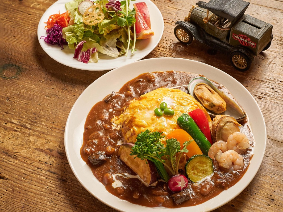 「大洲産野菜と海鮮の オムカレー(サラダ付き)」(1,600円)