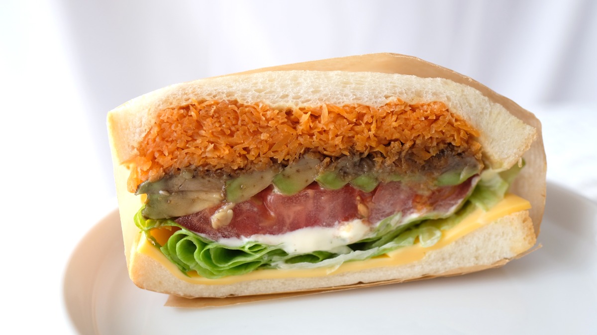 ニンジンやアボカドなど4種の野菜をサンド。ニンジンのラぺは醤油ベースのこっくりとした味わい。