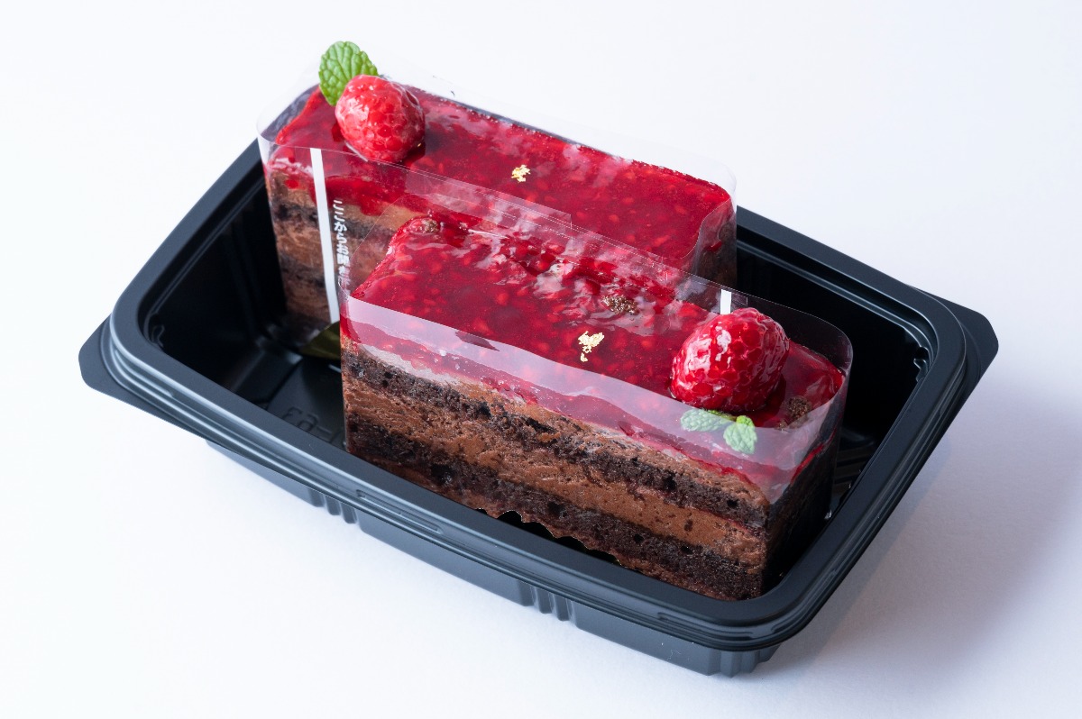 木苺ピューレ入りの酸味の効いたチョコムースとココア生地の上に、フランボワーズをトッピング。