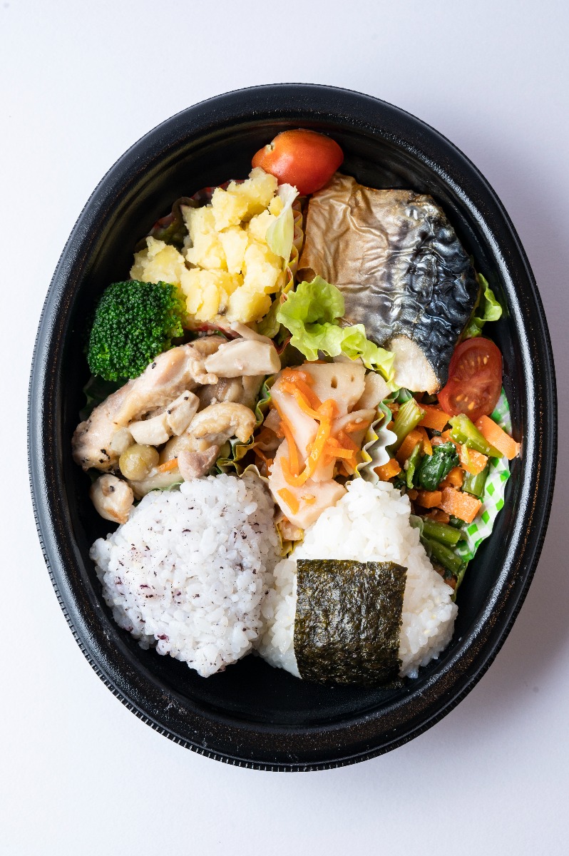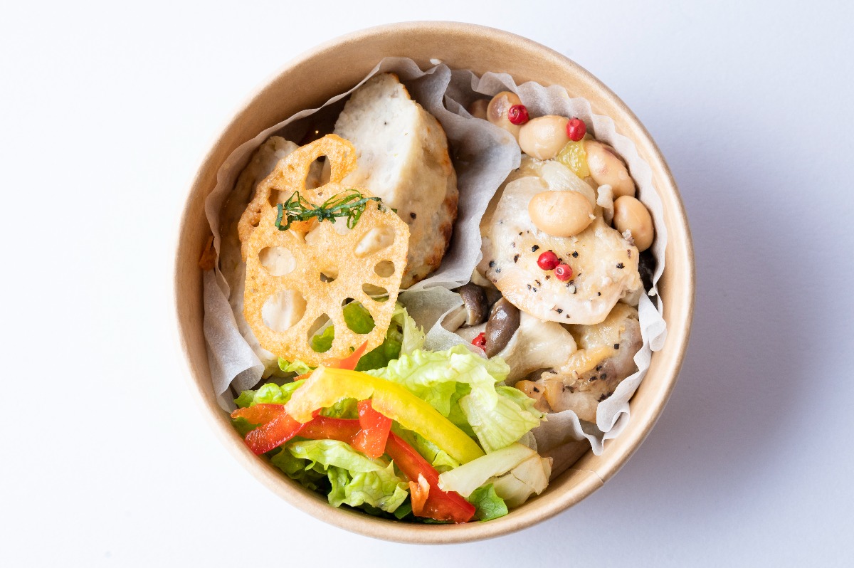 「ティア自然食堂」で店内調理したチキンクリーム煮、れんこんつくね、サラダが一口分ずつ入ったお手頃サイズ。