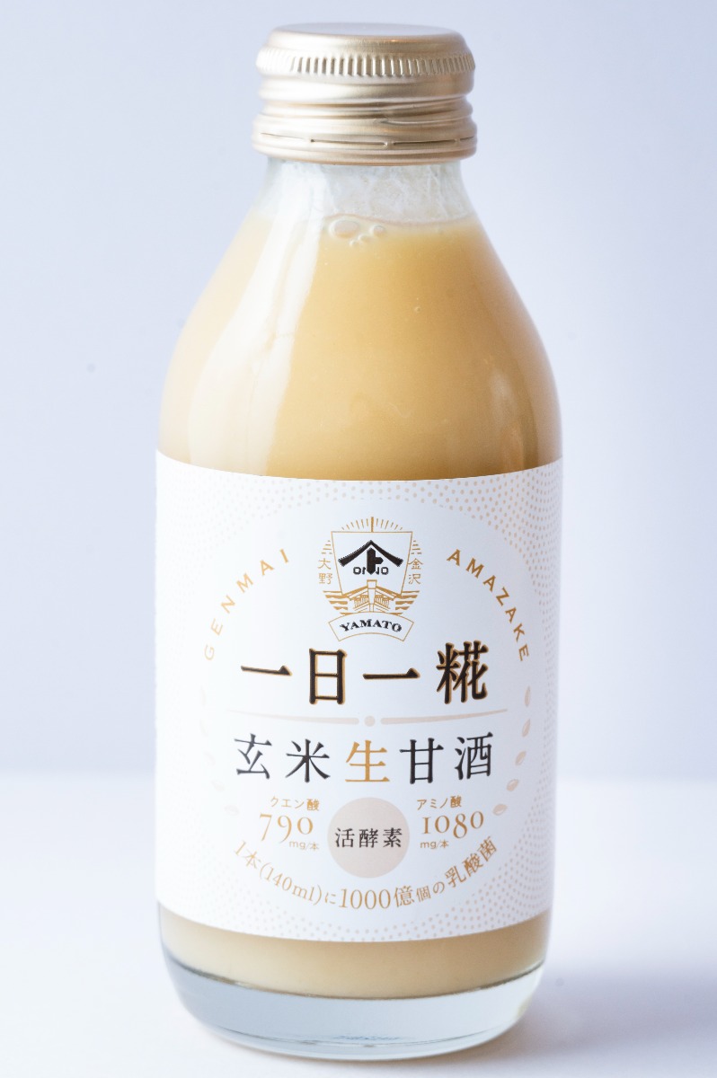 酵素を失活させない温度帯で充填し、生の米麹甘酒の酵素を生きたまま摂れる。砂糖不使用。