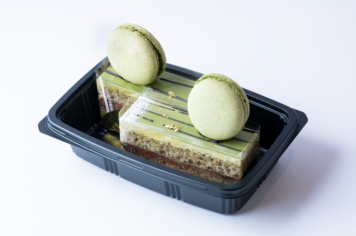 煎茶生地、抹茶バタークリーム、チョコガナッシュの3層で異なる食感が楽しめる。抹茶マカロンがオン!
