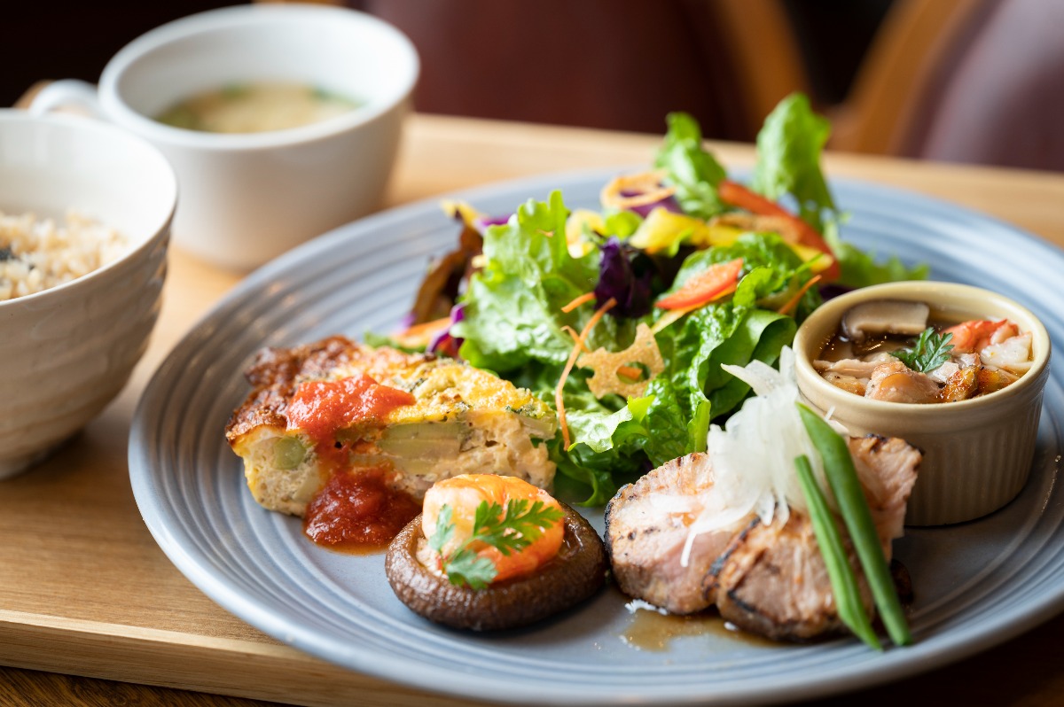 併設自然派レストラン「ティア自然食堂」では、選べる自然派ランチ(1,430円)が人気。10種の野菜料理の中から4種のおかずが選べる(季節によりおかずは替わる)