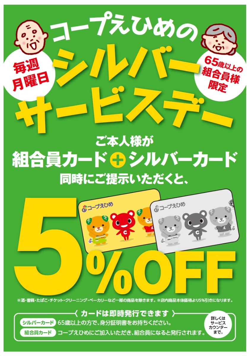 毎週月曜日は65歳以上の組合員限定で5%オフになる「シルバーサービスデー」。一部除外商品はあるが、多くの商品が割引になる。その他、毎月1・2・3日と毎週日曜は「チャージ特典キャンペーン」も。コープマネーチャージ金額の2%をプレゼントしてくれる。アプリにもお得情報満載!