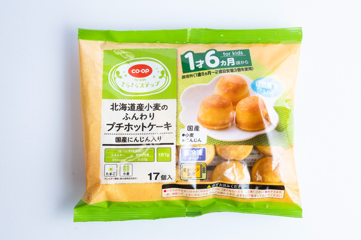 北海道産小麦と国産鶏卵、国産にんじんのパウダーを入れた、手づかみサイズのプチホットケーキ