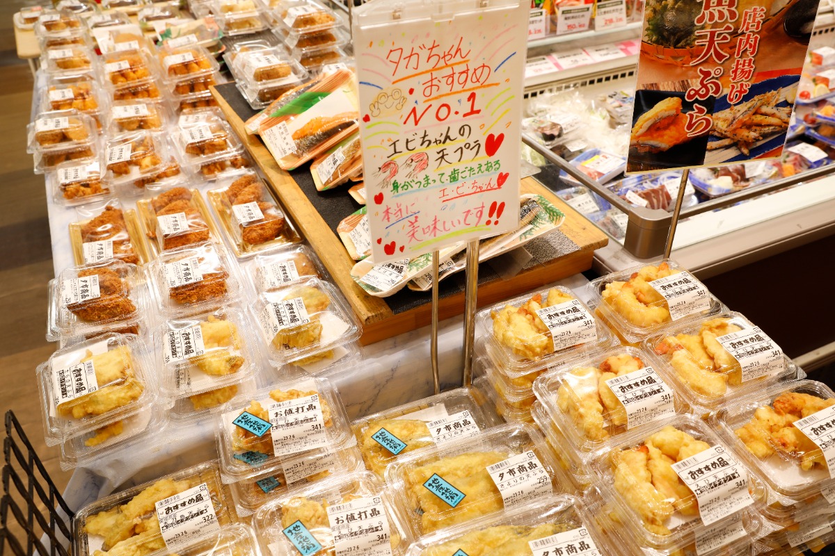 仕事帰りの若者からシニアまで、様々な人が訪れるという森松店。ここでは、ひとり暮らしの人がすぐに食べられるような惣菜が揃う。今のおすすめは、鮮魚をそのままフライや唐揚げにしたシリーズ。仕入れにより内容が変わるため、毎日惣菜を買いに来る人も飽きることなく楽しめる。