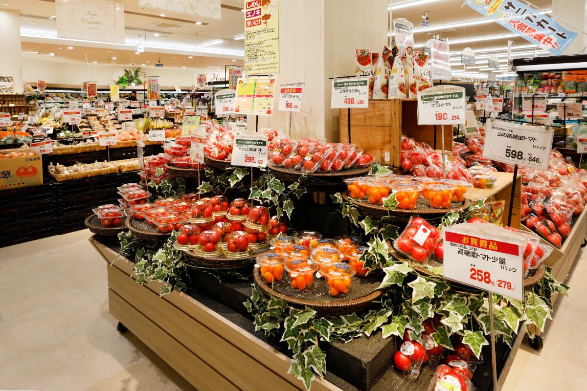 産地直送の新鮮な野菜や果物・魚などの他、季節に合わせたフェアも人気の束本店。何といっても特徴は、鮮魚コーナーに水槽があるところ。祝日を除く毎週月曜と土曜には「鮮魚市」を開催しており、新鮮な魚を求めて多くの人が訪れる。売り場で買った魚は、基本的な調理を無料で頼めるところも魅力。