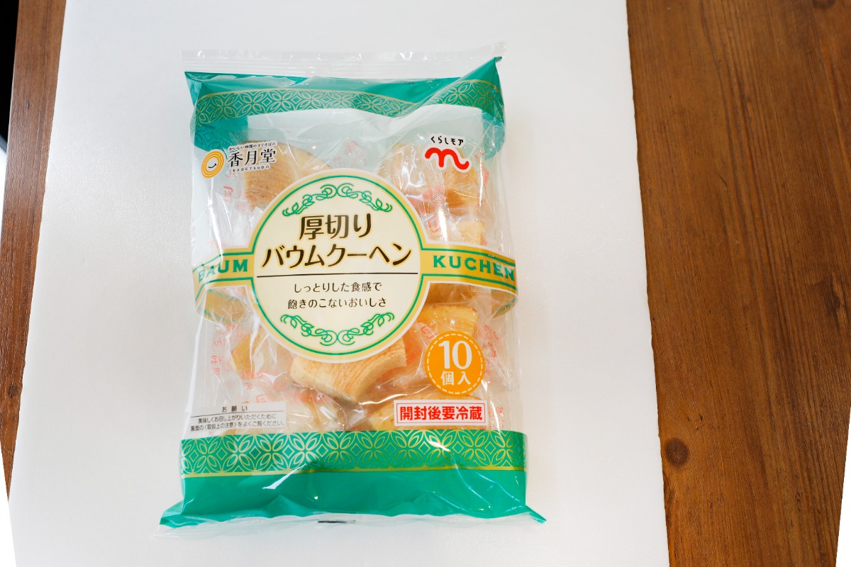 「くらしモア」の商品である「厚切りバウムクーヘン」(214円)は、食べやすいサイズ感とほんのり優しい甘さが特徴。一気に食べ切ってしまうほど飽きの来ない味。
