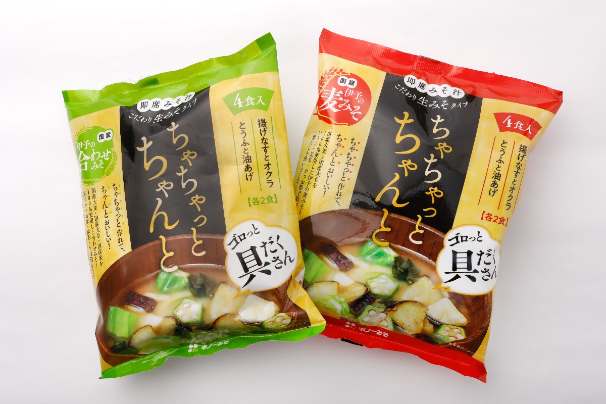 伊予の麦みそに、揚げナスオクラ・豆腐油揚げを具材に使用した贅沢感のあるみそ汁。