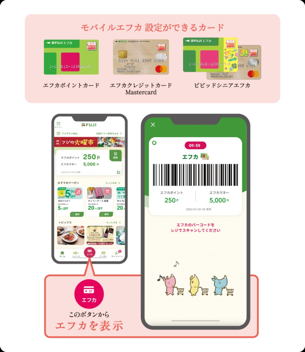 アプリにお手持ちのエフカを連携すると、エフカマネー残高やエフカポイントが確認できて便利!