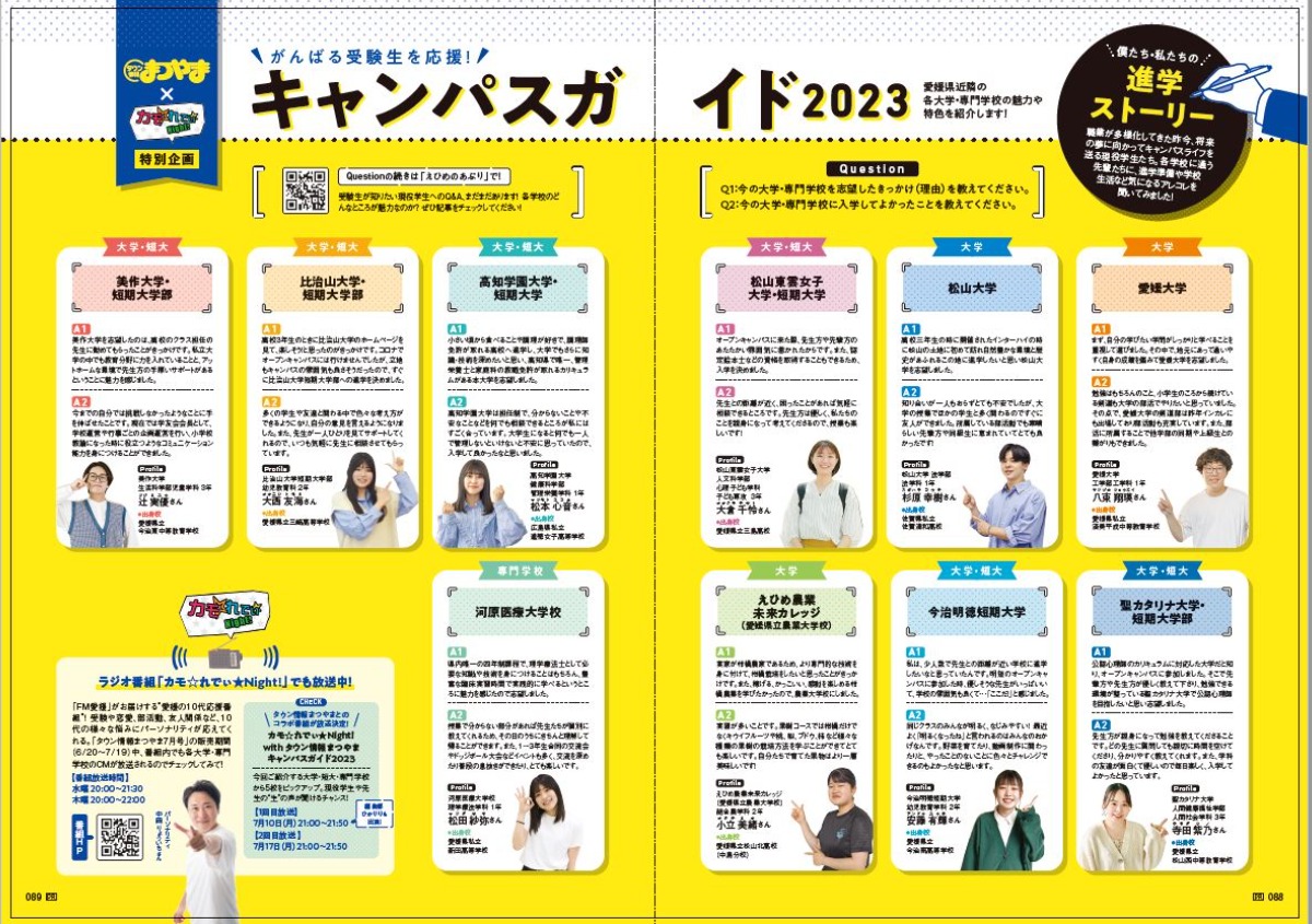 ラジオ番組「カモ☆れでぃ★Night!」とのコラボ企画を今年も実施! 職業が多様化してきた昨今、将来の夢に向かってキャンパスライフを送る現役学生のみなさんに、進学準備や学校生活のことなど、気になるあれこれをインタビュー。中国・四国地方の大学・専門学校の魅力や特色もたっぷりご紹介しています。「カモ☆れでぃ★Night! with タウン情報まつやま キャンパスガイド2023」の放送スケジュールも要チェック。