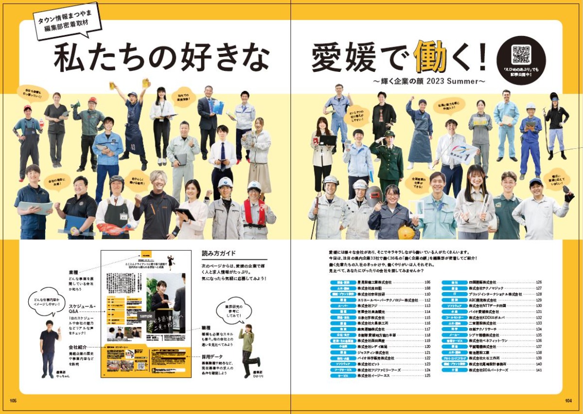 充実した休日を思いきり楽しむためには、時間、お金、そしてそのための働く環境選びはとても大事。愛媛には様々な会社があり、そこでキラキラしながら働いている人がとてもたくさんいます。今回はその中から注目の県内企業33社で働く36名の「企業の顔」を編集部が密着してご紹介。先輩たちの入社のきっかけや、働くやりがいは人それぞれ。見比べて、あなたにぴったりな会社を探してみませんか?