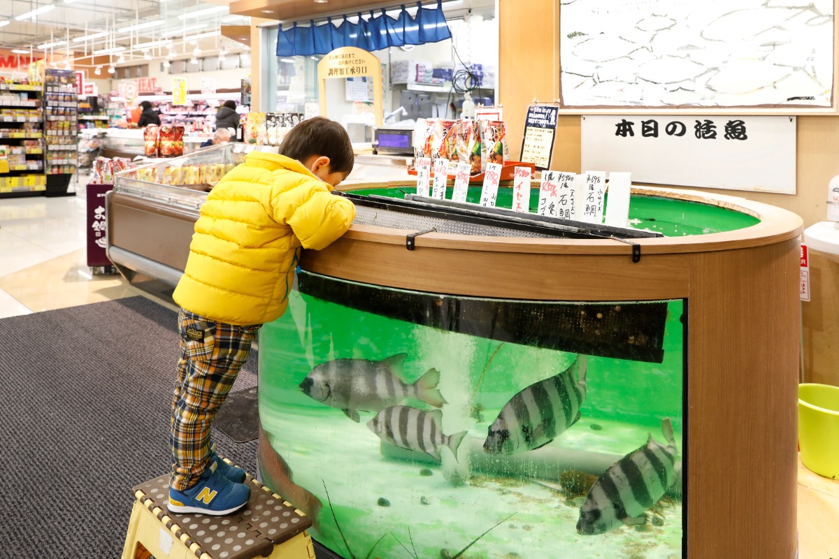 鮮魚コーナーに水槽がある「サニーマート」や、「コープえひめ」の離乳食商品、「イオンモール今治新都市」のプレイスペースなど子育て世代に嬉しい情報も。